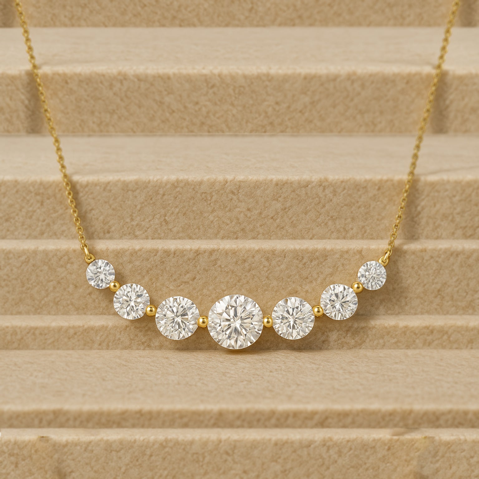 The Radiant Bar Necklace features a graceful row of seven round-cut cubic zirconia stones, artfully arranged from smallest to largest and set in 18k gold-plated stainless steel. Suspended on a delicate chain, this piece exudes balance and brilliance—perfect for layering or wearing solo. With its waterproof and anti-tarnish finish, it’s designed to shine through everyday elegance and special occasions alike.